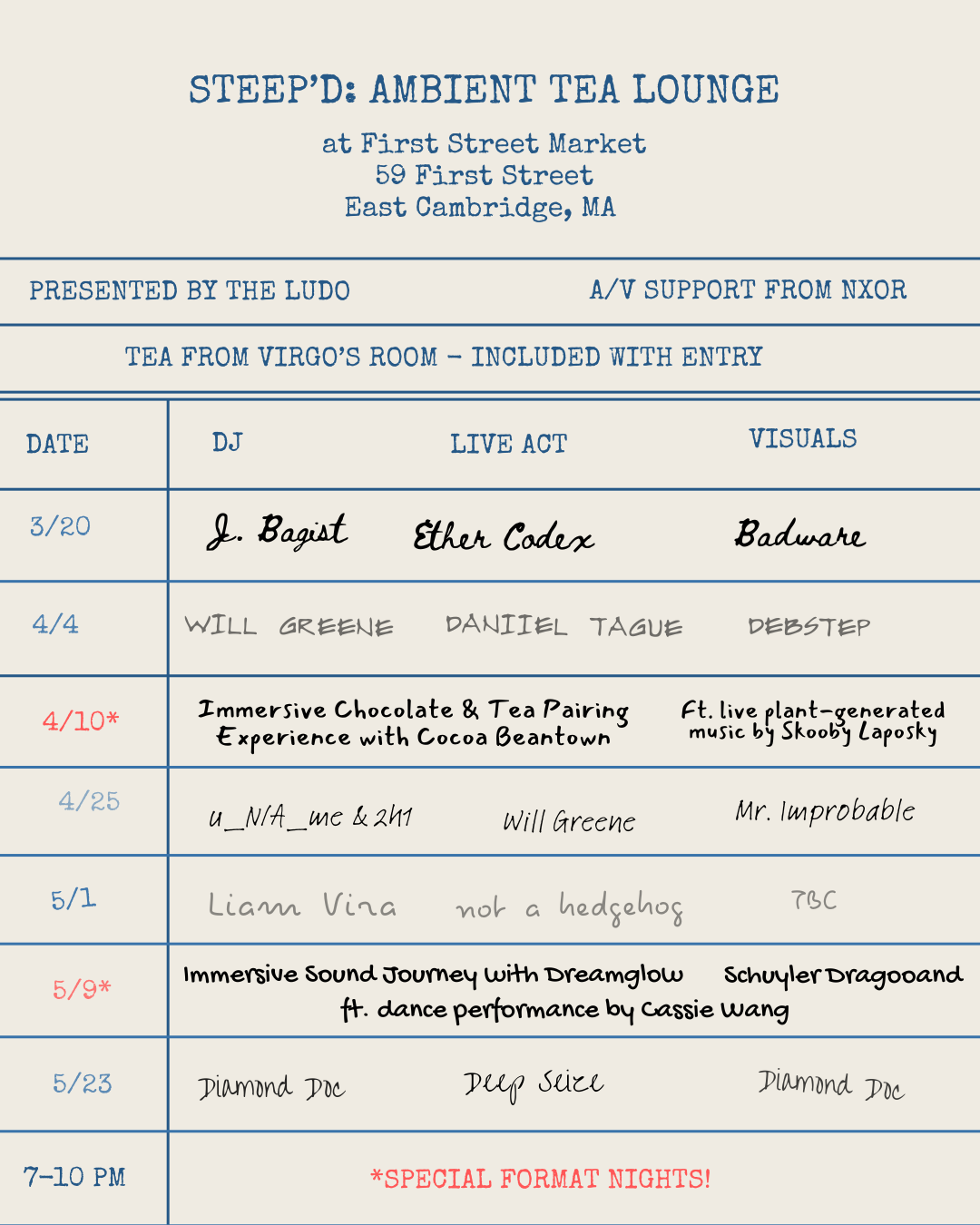 Each night is a unique blend of performance and presence, with a rotating lineup of musical performances, DJs, and visuals, alongside handcrafted teas from Virgo’s Room (included with your ticket!) and gentle activities to support your flow between solo and social time, as it suits your intentions for the evening.